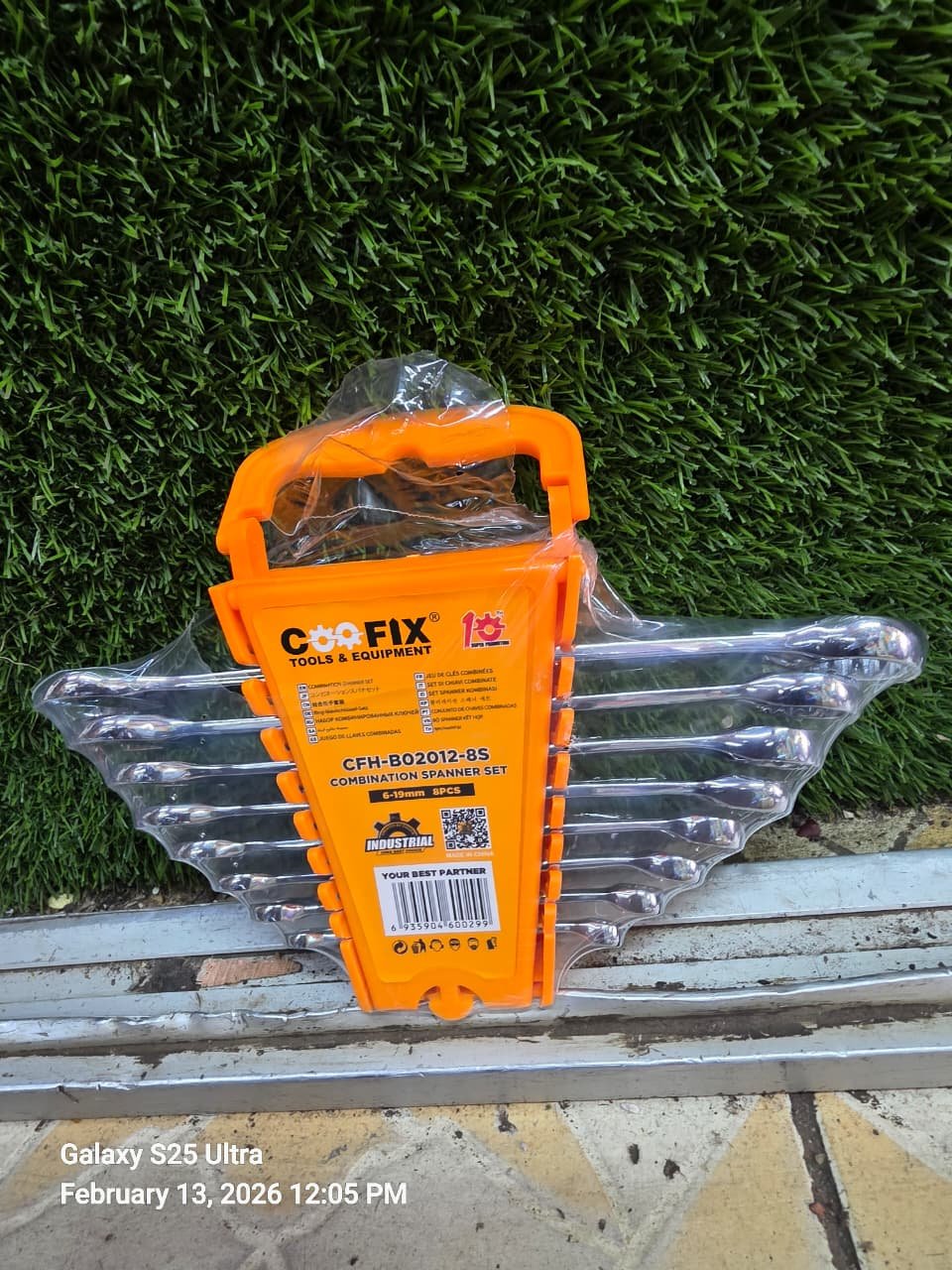 The Coofix Combination Spanner Set is a hand tool kit that includes a range of combination wrenches designed for tightening and loosening hex nuts and bolts. Each spanner in the set has an open end on one side and a ring (box) end on the other, giving you flexibility to work in different situations where access or grip varies.