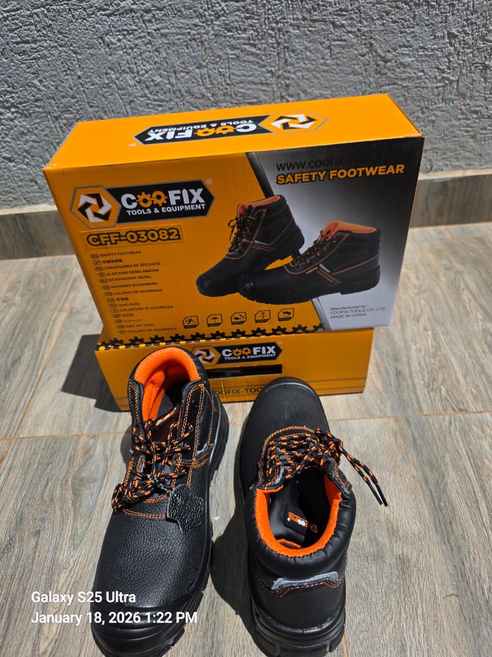 The Coofix safety boots (Size 41) are protective work footwear designed for use in demanding environments such as construction sites, workshops, factories, and industrial areas. These boots are built with a reinforced steel toe cap that protects the feet from falling objects and compression injuries, making them essential for workplace safety.