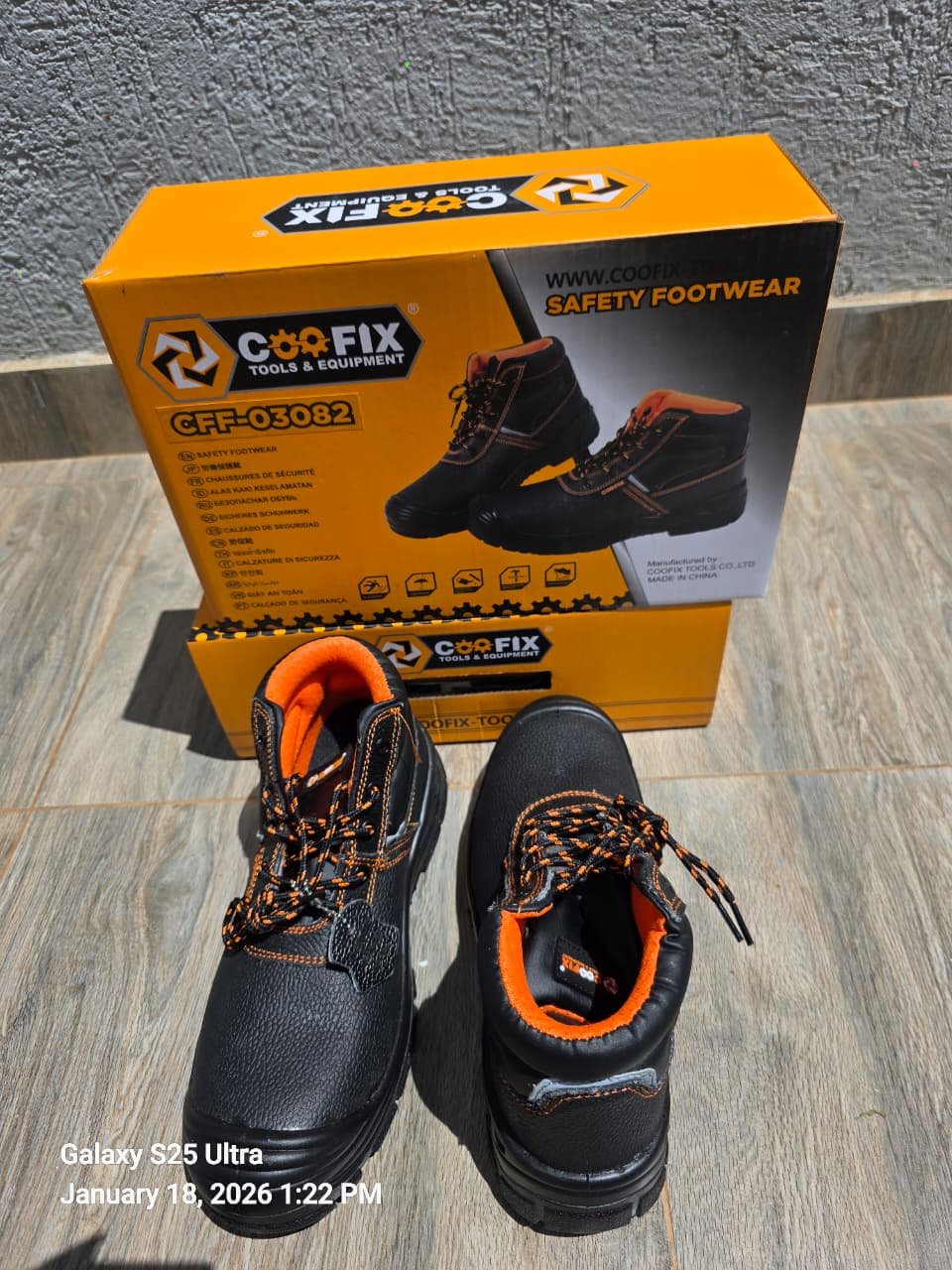 The Coofix safety boots (Size 42) are heavy-duty protective footwear designed for use in demanding work environments such as construction sites, workshops, and industrial settings. They are built with a strong steel toe cap that helps protect the feet from impact, falling objects, and compression injuries, making them essential personal protective equipment (PPE).