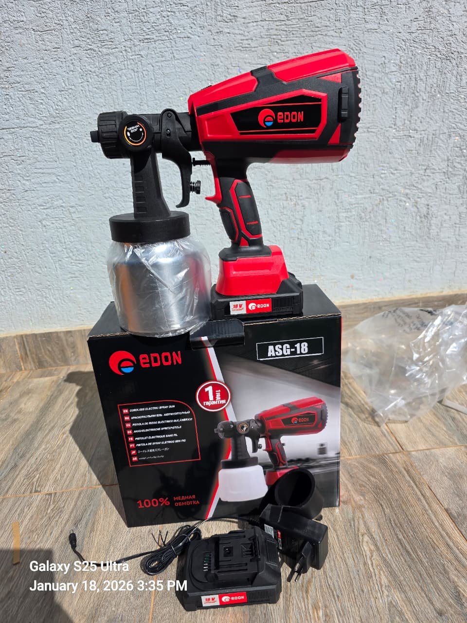 The Edon Cordless Spray Gun is a compact and efficient painting tool designed to deliver smooth, even finishes without the hassle of cords or compressors. Powered by an 18V rechargeable lithium-ion battery, it offers full mobility, allowing you to work freely indoors or outdoors without needing a power outlet.