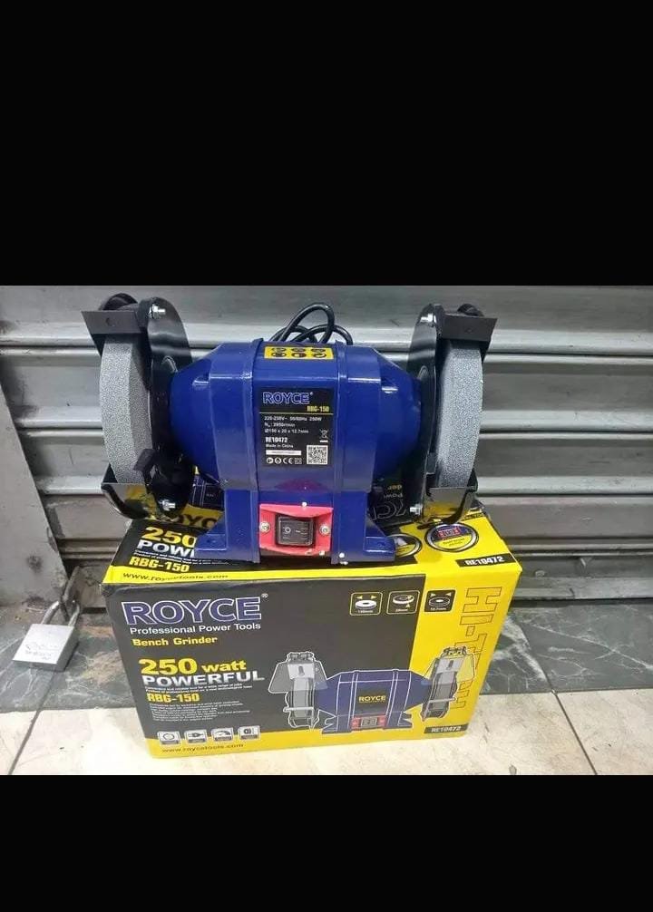 The Royce Bench Grinder is a compact and reliable electric grinding machine designed for a variety of workshop and DIY applications. Powered by a 250 W motor, it delivers steady performance for sharpening tools, removing rust, shaping metal parts, and polishing surfaces. The grinder typically features 125 mm abrasive wheels that rotate at around 2950 revolutions per minute, providing sufficient speed and contact area for efficient material removal and finishing work.